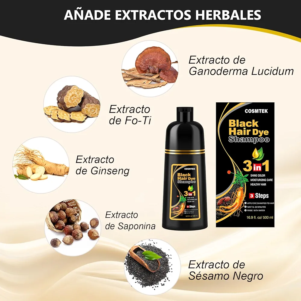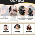 Despídete de las canas: Este shampoo para canas cubre eficazmente las canas, devolviendo un tono negro intenso y renovado que se mantiene entre 3 y 4 semanas. Incluye guantes y una capa protectora para una aplicación más sencilla y limpia. (Realiza una prueba de alergia antes del primer uso).