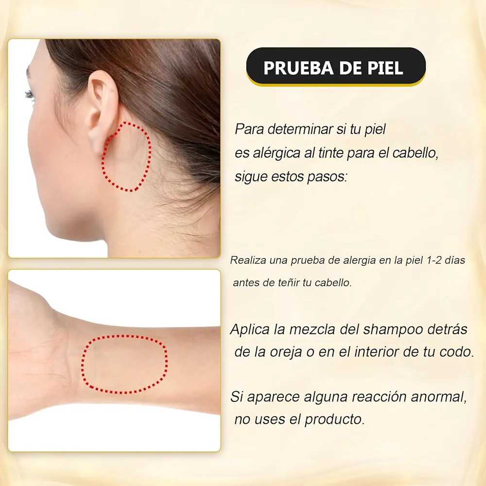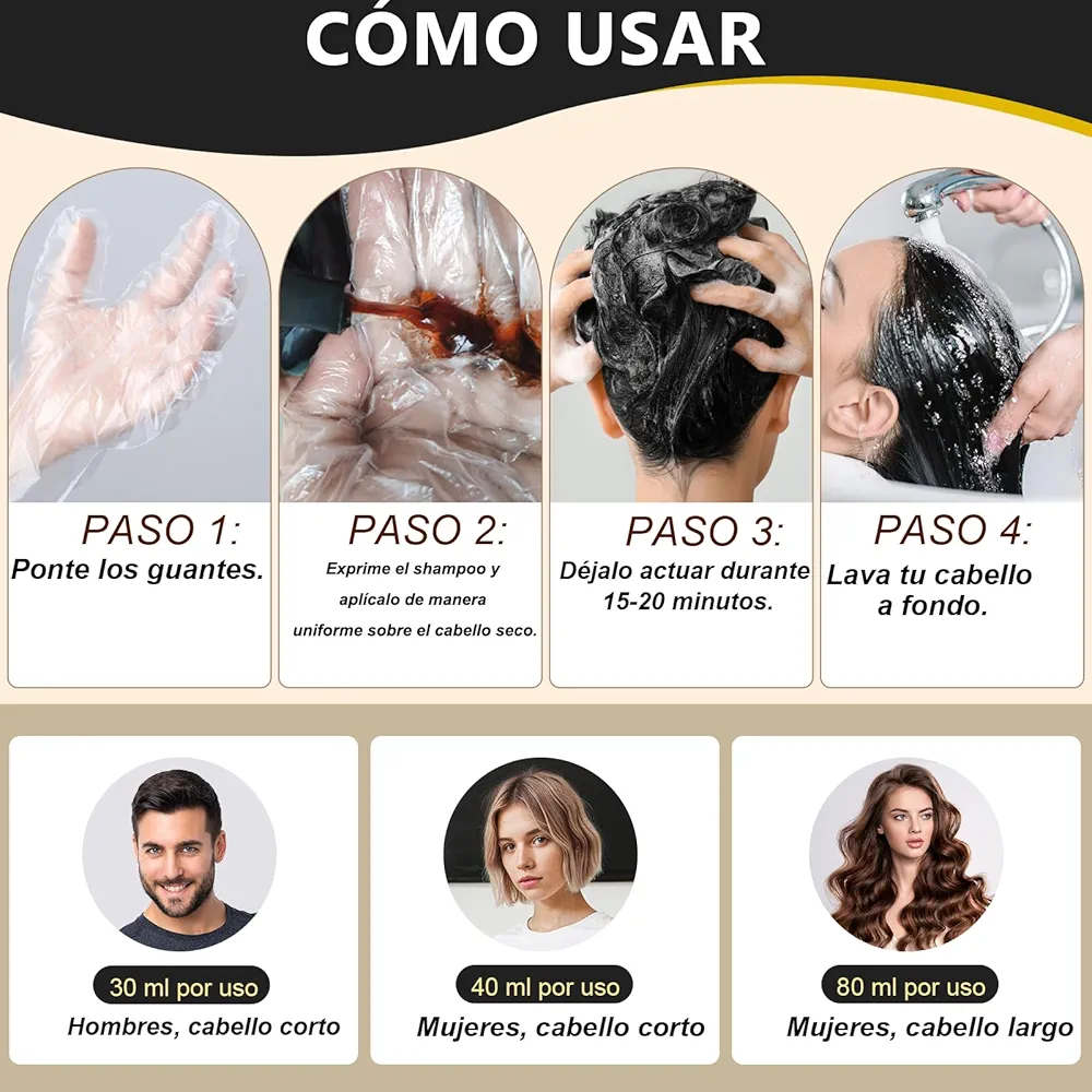 Aplicación sin complicaciones: Úsalo sobre el cabello seco con los guantes puestos. Distribuye el shampoo tinte cubre canas uniformemente y enjuaga después de 15-20 minutos. Su fórmula está diseñada para lograr una cobertura uniforme y un acabado natural. (Aplicar únicamente sobre cabello seco).