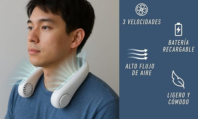 - Este versátil ventilador de cuello portátil ofrece tres velocidades ajustables para mantener tu frescura personal.